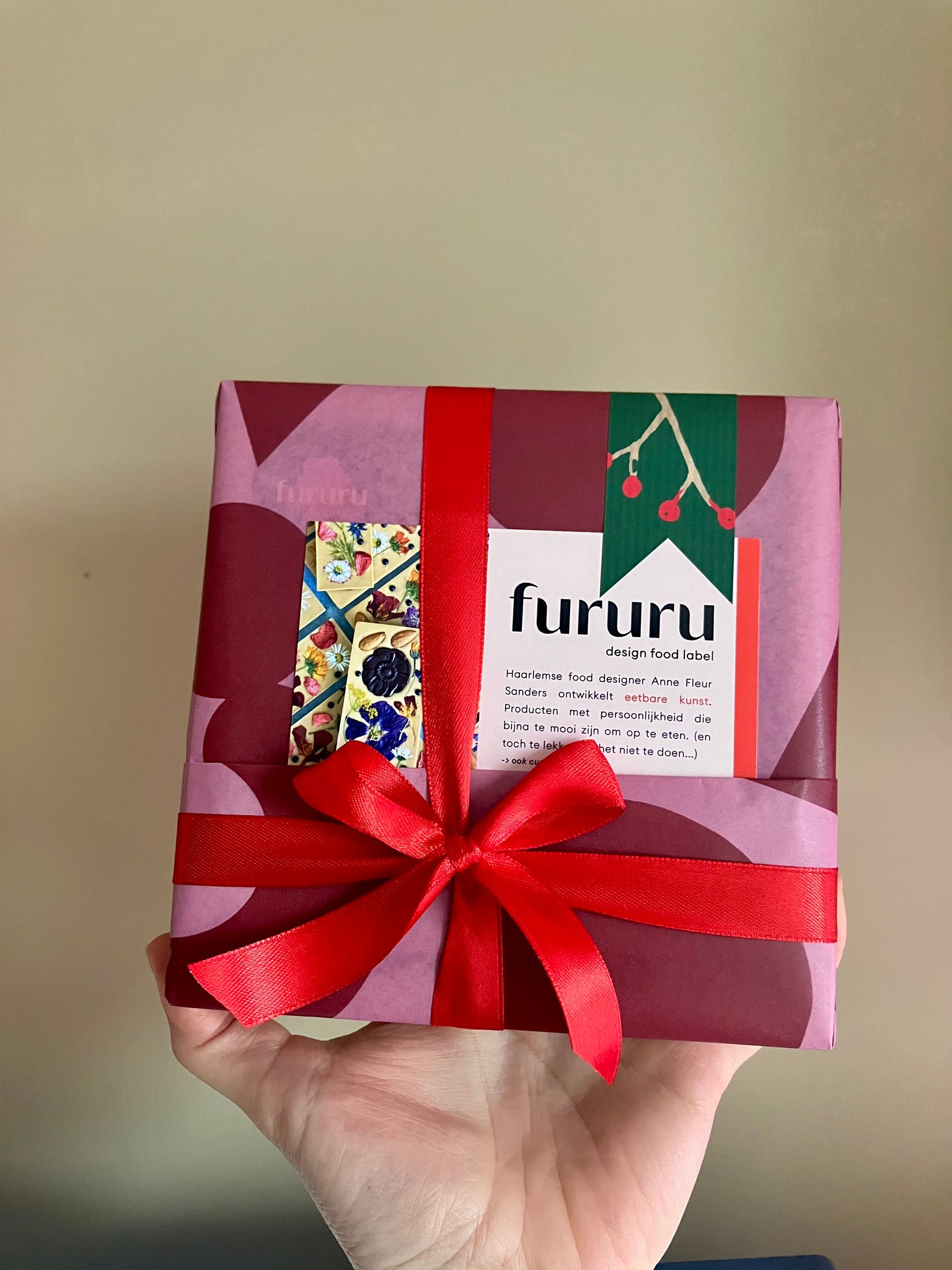Een klein bloemenreepje en 6 handbeschilderde bonbons.