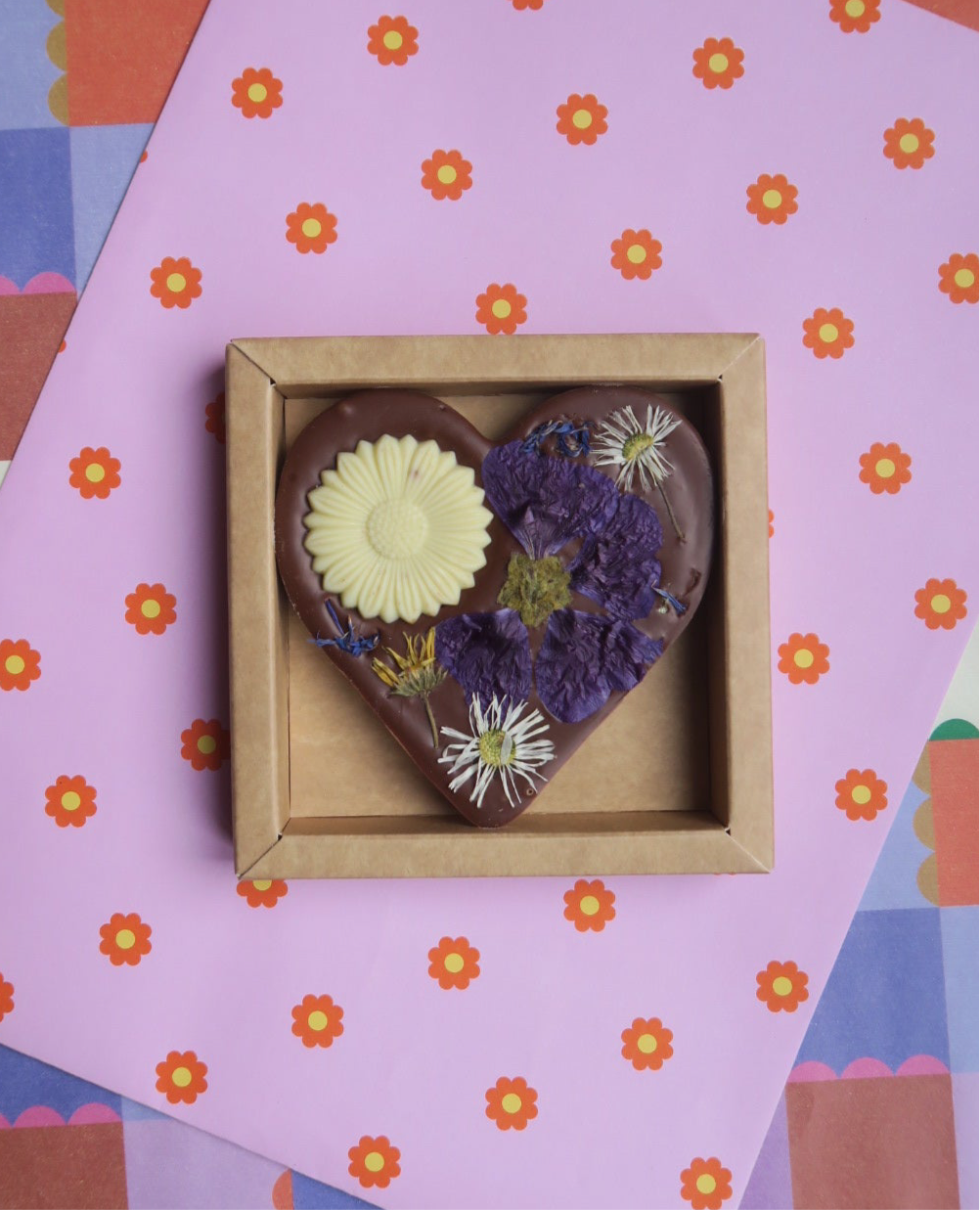 Een hart van Belgische Fairtrade melkchocolade met handgeplukte eetbare biologische bloemen uit Haarlem.